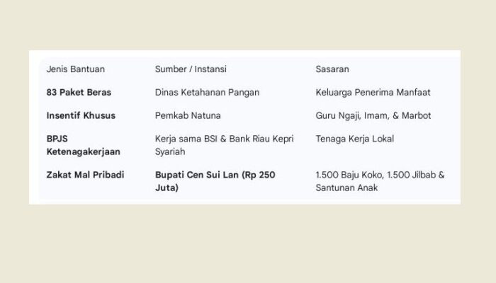 Dengan bantuan yang menyasar berbagai sektor—mulai dari pangan hingga jaminan sosial—Pemkab Natuna berharap indeks kebahagiaan dan religiusitas masyarakat terus meningkat di tahun 2026 ini.