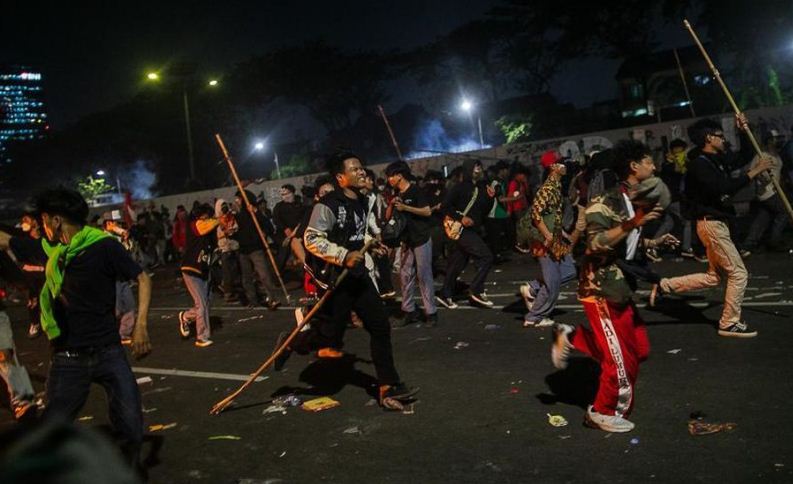 Mobil pengurai massa bersama pasukan polisi bermotor lalu menyisir demonstran hingga ke arah Gerbang Pemuda, Jakpus