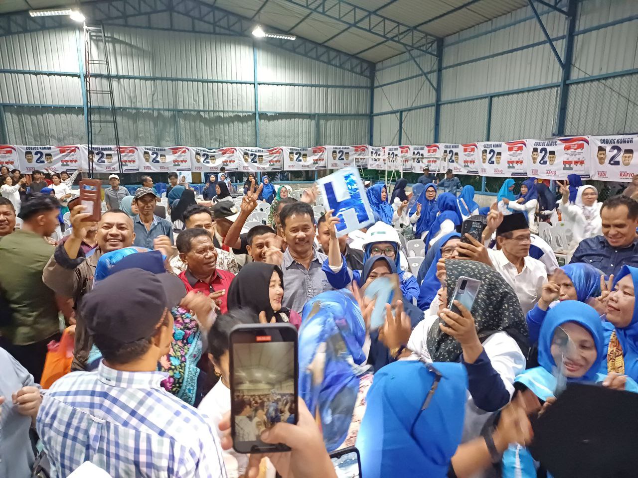 Suasana cair penuh kegembiraan dan kemeriahan terlihat saat pendukung Rudi-Rafiq/2R yang umumnya emak-emak, menampilkan berbagai kreativitasnya di bidang seni. Bahkan, ada yang membawa poster huruf saat digabungkan terbaca “HMR Beraura”.