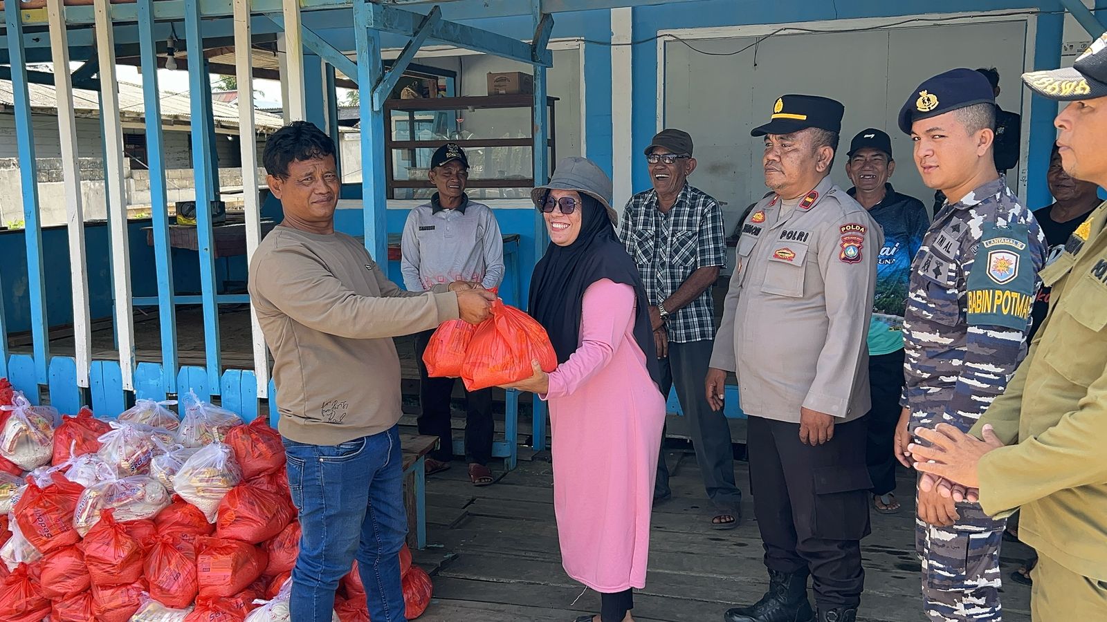 Babinpotmar Pos TNI AL (Posal) Midai turut serta membantu membagikan paket Sembako untuk warga Pulau Midai, yang diinisiasi oleh kelompok kapal cumi yang mencari cumi di Perairan Pulau Midai, Sabtu (8/3/2025). (Foto: ist)