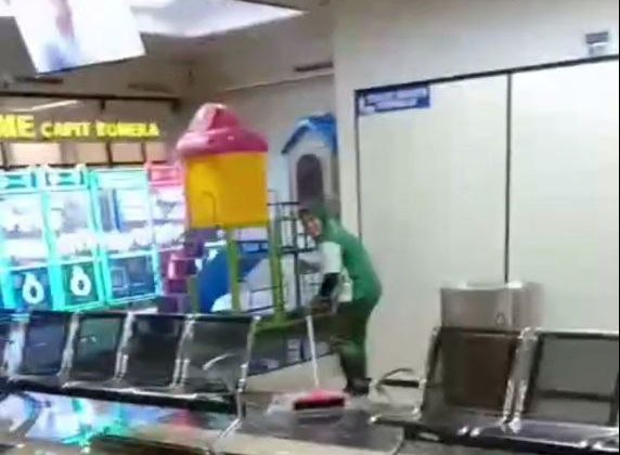 Tampak sejumlah petugas kebersihan bandara bertungkus lumus mengeringkan air di ruang tunggu A7 kedatangan internasional tersebut yang berada di Lantai 2.