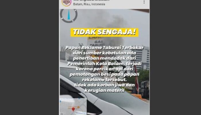 Melalui akun Instagram resminya, @warungtaburai.batam, pihak manajemen mengonfirmasi insiden tersebut. “Papan reklame Taburai terbakar. Dari sumber, kebetulan ada penertiban mendadak dari Pemko Batam. Terjadi karena percikan api dari pemotongan besi pada papan reklame tersebut. Tidak ada korban jiwa,” tulis admin dalam unggahan Instagram.