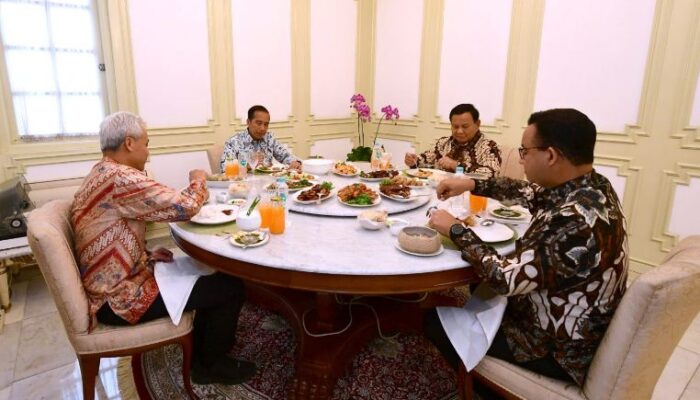 Presiden Jokowi makan siang bareng tiga capres di istana negara, Senin (30/10/2023). (Foto: Setkab)