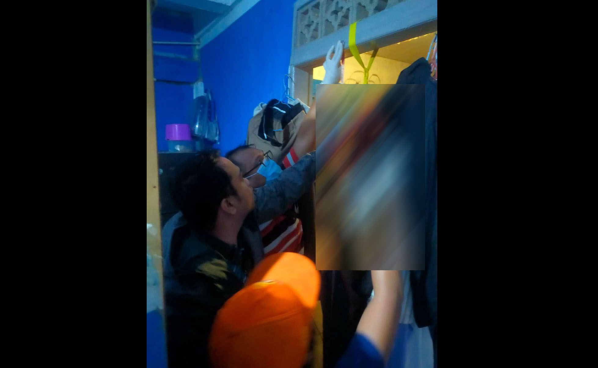 Mereka pun terkejut. Hal menakutkan itu memang terjadi. Tubuh Imas ditemukan kaku tergantung tali body harnes warna kuning di kusen pintu kamar.